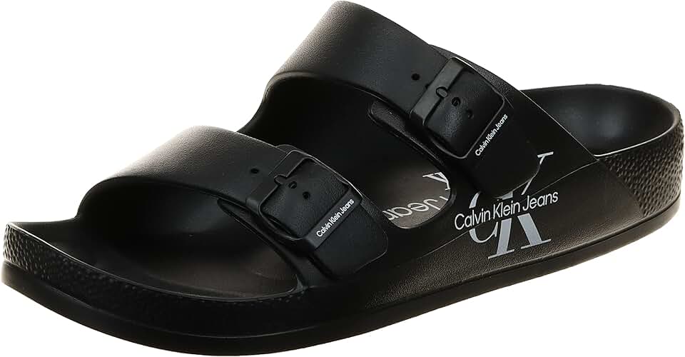 Prepare for the heat with the Zion slide from Calvin KleinĀ®. Detailed footbeds contour to your foot while providing heightened details with dual adjustable straps and monogram branding