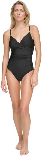 A chic twist at the bust plays up your curves in this one-piece from Calvin Klein, a stylish look with tummy control that helps smooth your silhouette.