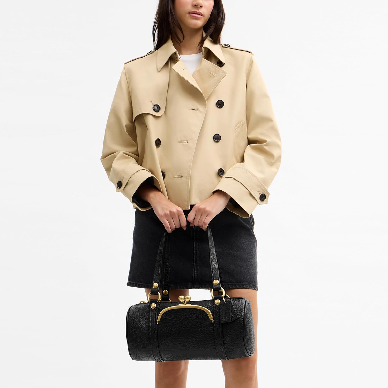 Part of The Coach Originals, a collection that celebrates our authentic New York heritage, this large frame barrel bag carries it all with a perfectly classic 90s inspired kisslock closure. Crafted of textured pebble leather for added character, this bag features a zip-top closure, fabric lining, handles with 10' drop, outside kisslock pocket, 13 1/4' (L) x 6' (H) x 6' (W).