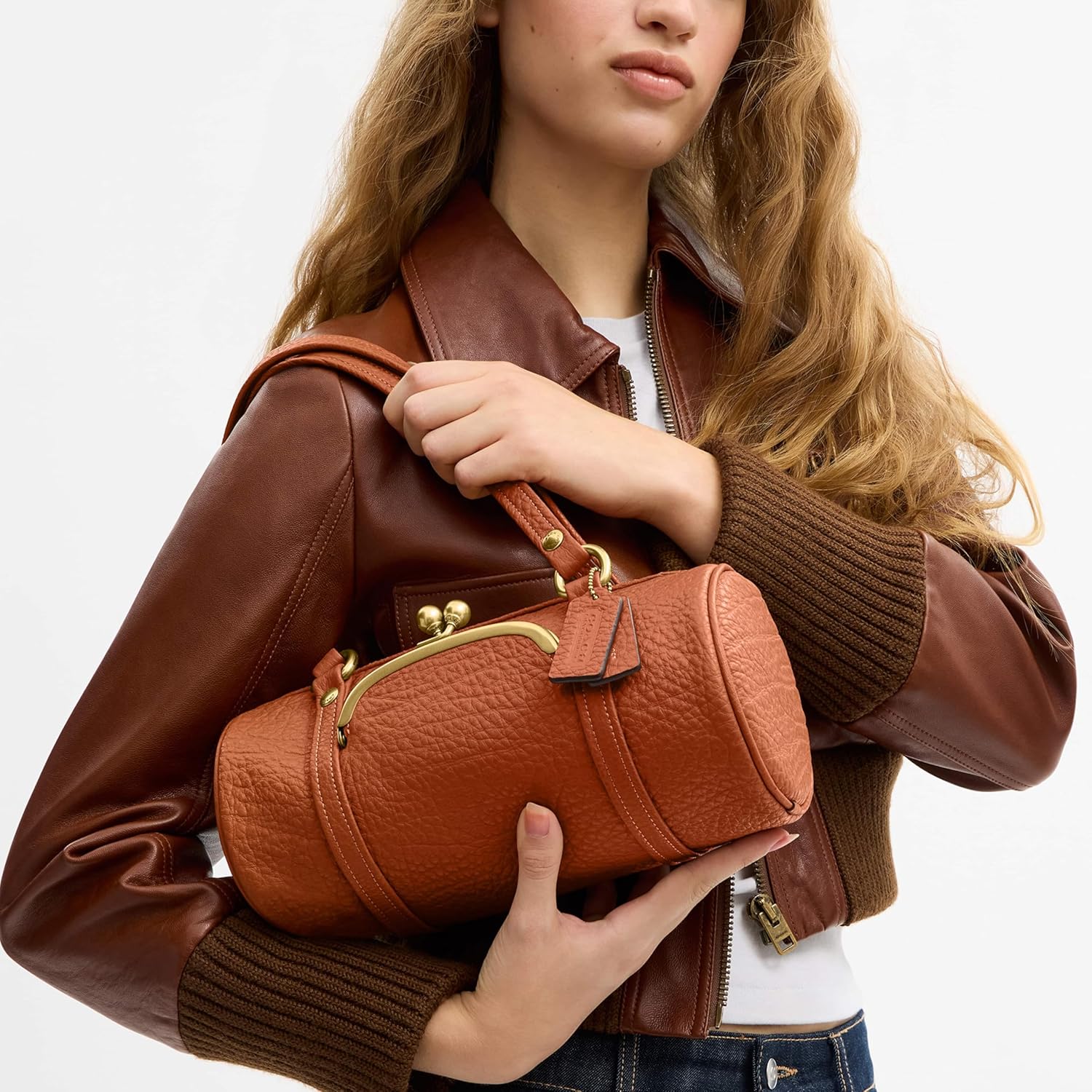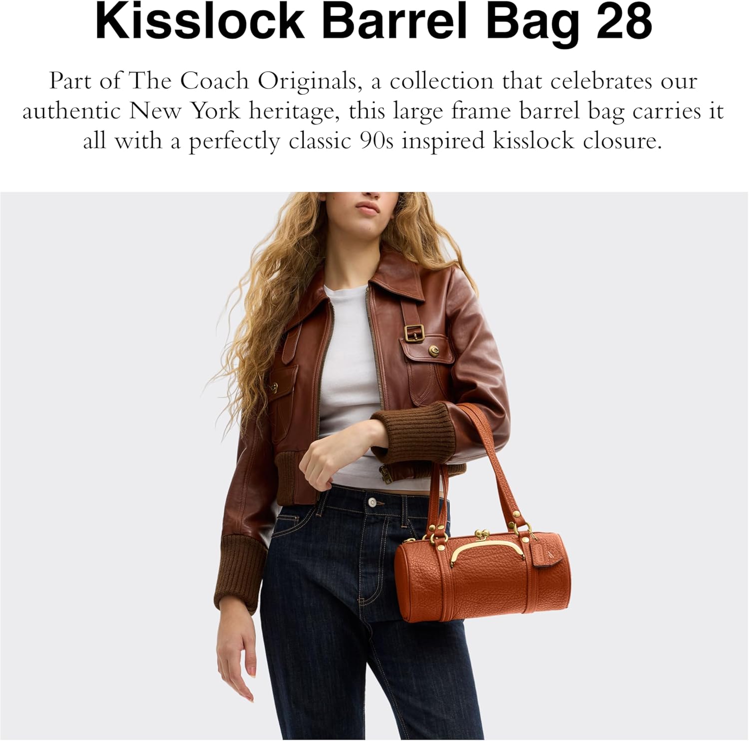 Part of The Coach Originals, a collection that celebrates our authentic New York heritage, this large frame barrel bag carries it all with a perfectly classic 90s inspired kisslock closure. Crafted with velvety suede and supple full-grain leather for an elevated, sophisticated look, this spacious bag features an inside snap pocket, zip-top closure, fabric lining, handles with 9 3/4' drop, outside kisslock pocket, 10 3/4' (L) x 5' (H) x 5' (W).