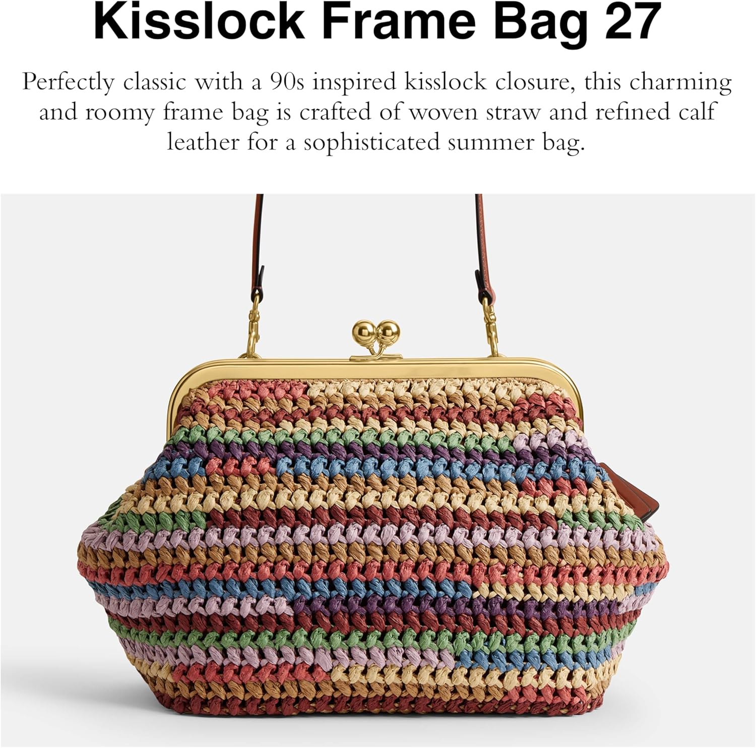 Perfectly classic with a 90s inspired kisslock closure, this charming and roomy frame bag is crafted of woven straw and refined calf leather for a sophisticated summer bag. Featuring one credit card slot, inside zip pocket, kisslock closure, regenerative cotton lining, detachable handle with 10 1/2' drop, 10 1/2' (L) x 9 3/4' (H) x 7 3/4' (W).