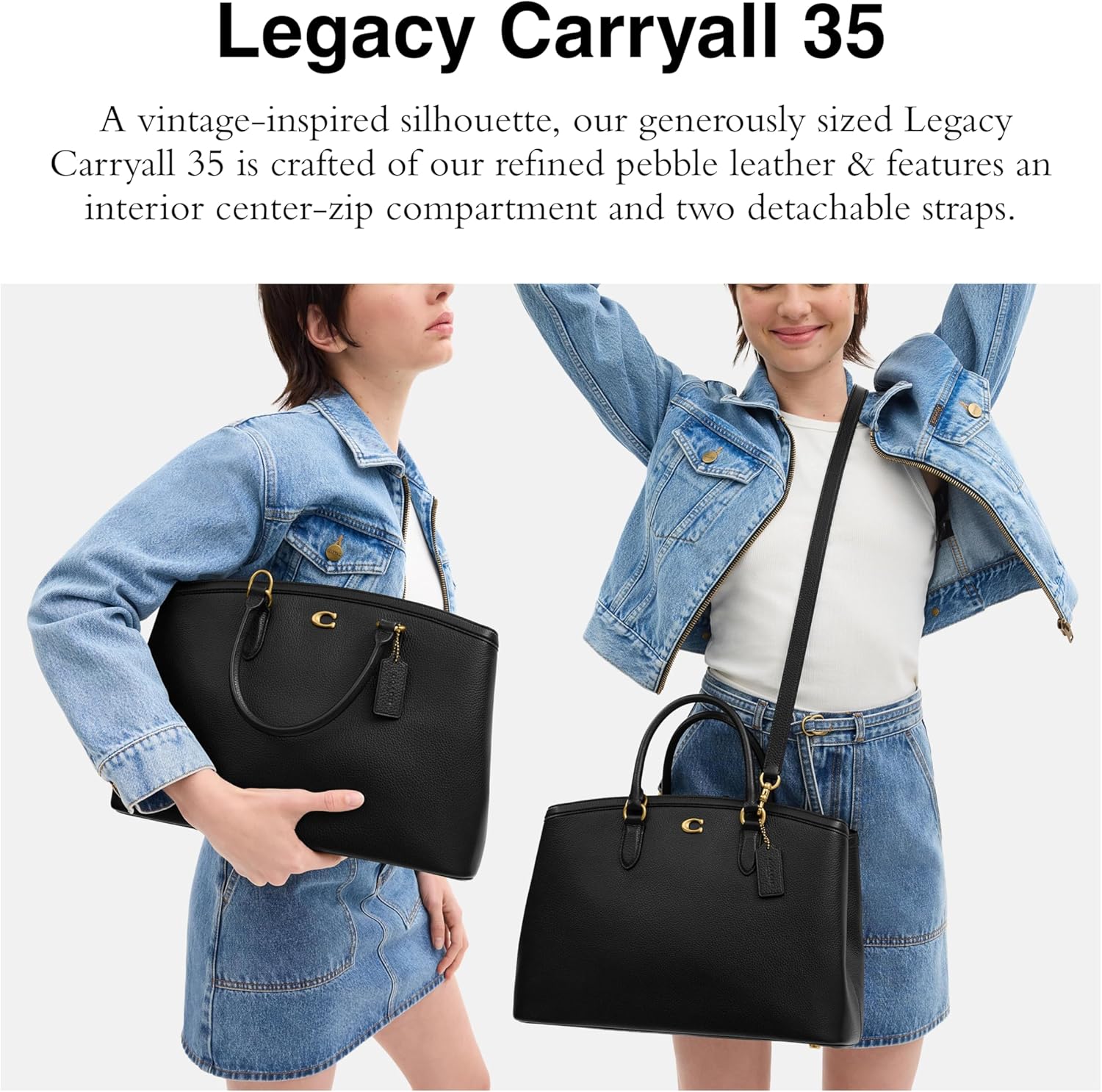 A vintage-inspired silhouette, our generously sized Legacy Carryall 35 is crafted of our refined pebble leather & features a secure interior center-zip compartment and 2 detachable straps for extra versatility. Carry this versatile bag by the top handles or attach the long crossbody strap to style to as a shoulder bag or crossbody bag.
