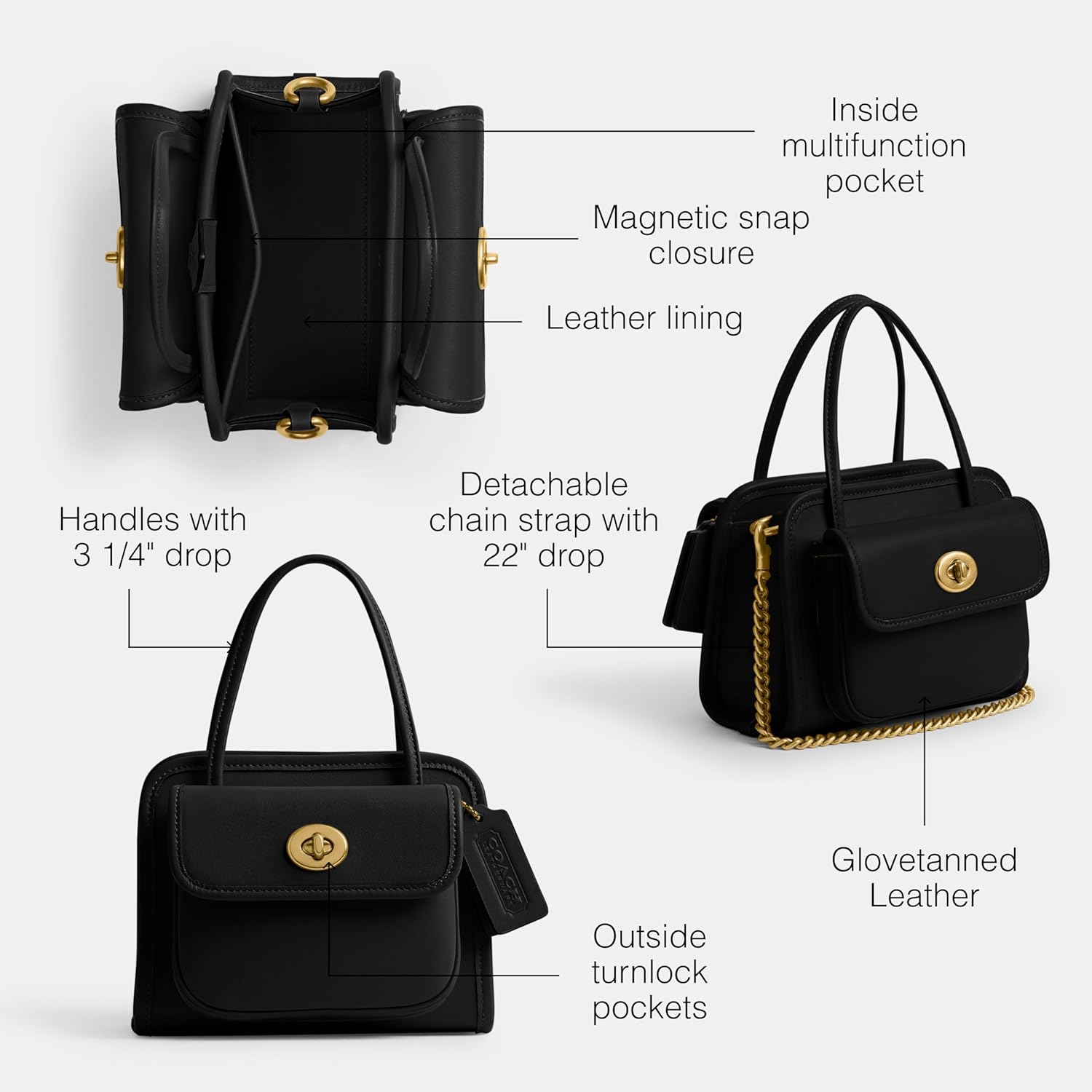 Glovetanned leather Inside snap pocket Zip-top closure, fabric lining Detachable short strap with 11 1/2' drop Detachable chain strap with 11 1/2' drop Detachable long strap with 21 1/2' drop for shoulder or crossbody wear 10 3/4' (L) x 4 1/2' (H) x 4' (W)