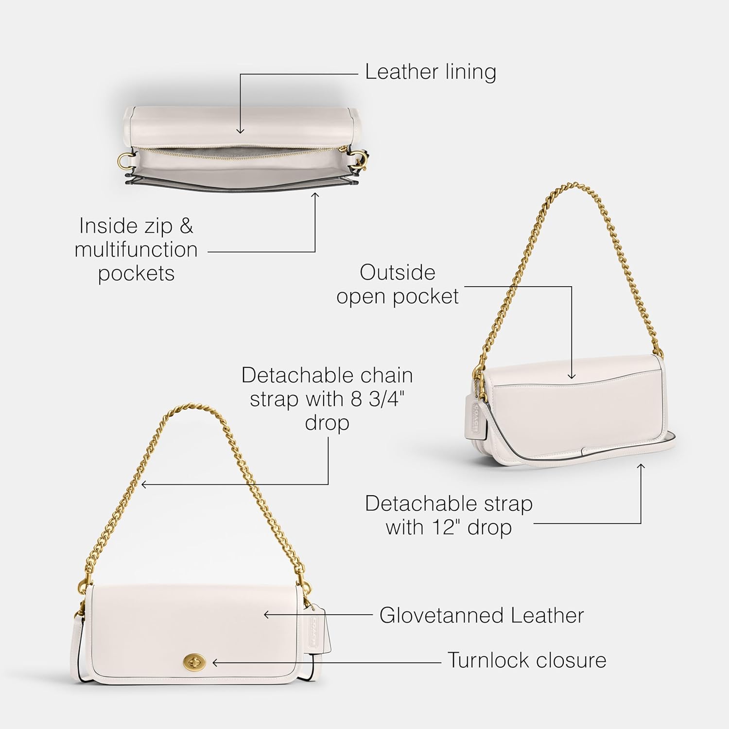Glovetanned leather Inside multifunction pocket Zip and flap closures Outside open pocket Adjustable strap with 20' drop for shoulder or crossbody wear 10 3/4' (L) x 9' (H) x 3 1/4' (W) The Coach Originals