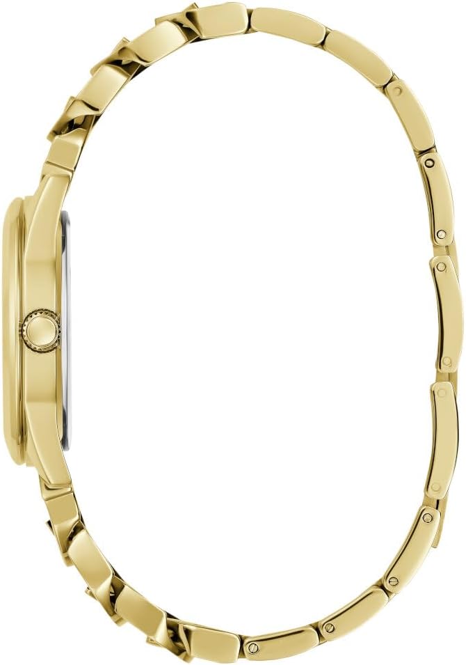 A minimalist style with an unexpected glamorous touch, this gold-tone watch features simple hour markers on the analog dial and crystal accents on the curb chain-inspired links to the polished steel bracelet.