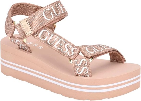 Logo graphic straps elevated on a chunky platform heel lend warm-weather lift to casual style in the Avin sandals from GUESS. The EVA wedge, velcro straps and comfort features makes this the perfect sandal with a balance of fashion comfort. This is for going to be your go-to sandal for the season.