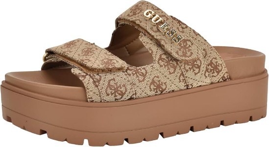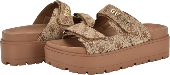 Embrace the sporty-chic trend with these versatile Guess platform slide sandals. Combining comfort with a bold, contemporary look, these slides are perfect for adding an edgy, elevated touch to your casual style. Featuring two wide, adjustable straps across the foot with a metal Guess logo detail.