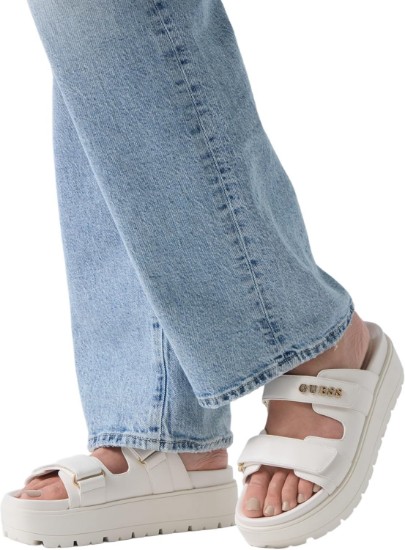 Embrace the sporty-chic trend with these versatile Guess platform slide sandals. Combining comfort with a bold, contemporary look, these slides are perfect for adding an edgy, elevated touch to your casual style. Featuring two wide, adjustable straps across the foot with a metal Guess logo detail.