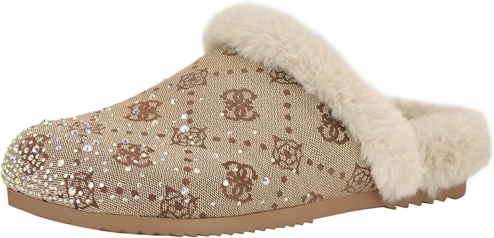 Glistening rhinestones and Guess logo upper matierals make this mule a show stopper. This slip-on mule is lined with fluffy faux sheraling for added warmth and comfort. Est. 1981, Guess is a global lifestyle brand and a symbol of a young, adventurous lifestyle.