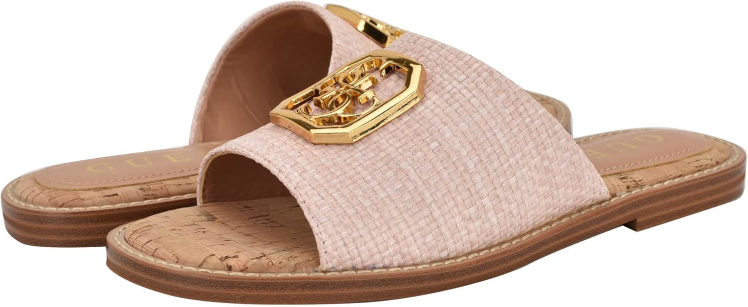 Step in style this season wearing the Graysie by Guess. This chic sandal highlights a cork footbed enhanced with woven upper material. The gold quattro G logo creates touches of hardware interest. Est. 1981, Guess is a global lifestyle brand and a symbol of a young, adventurous lifestyle.