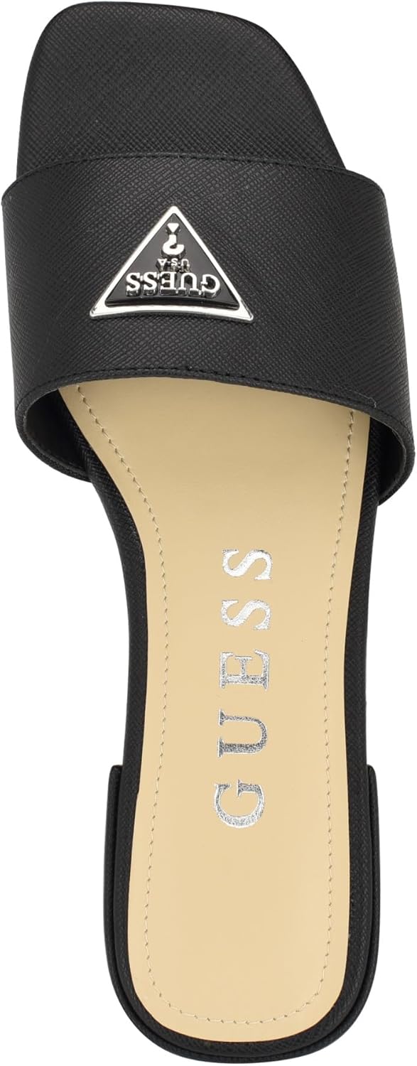 Adorned with a metal GUESS logo plate, this one band slide is your go to sandal of the season. Fashion forward colors and materials and a little block heel allow for style and comfort. Est. 1981, Guess is a global lifestyle brand and a symbol of a young, adventurous lifestyle.