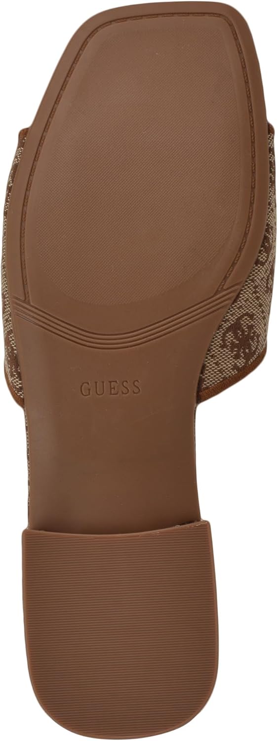 Add an effortless chic appeal to your wardrobe wearing the Tarishae by Guess. Easy to slide on, the Quattro-G fabric and chop out G logo add special touches to this single band flat sandal. Est. 1981, Guess is a global lifestyle brand and a symbol of a young, adventurous lifestyle.