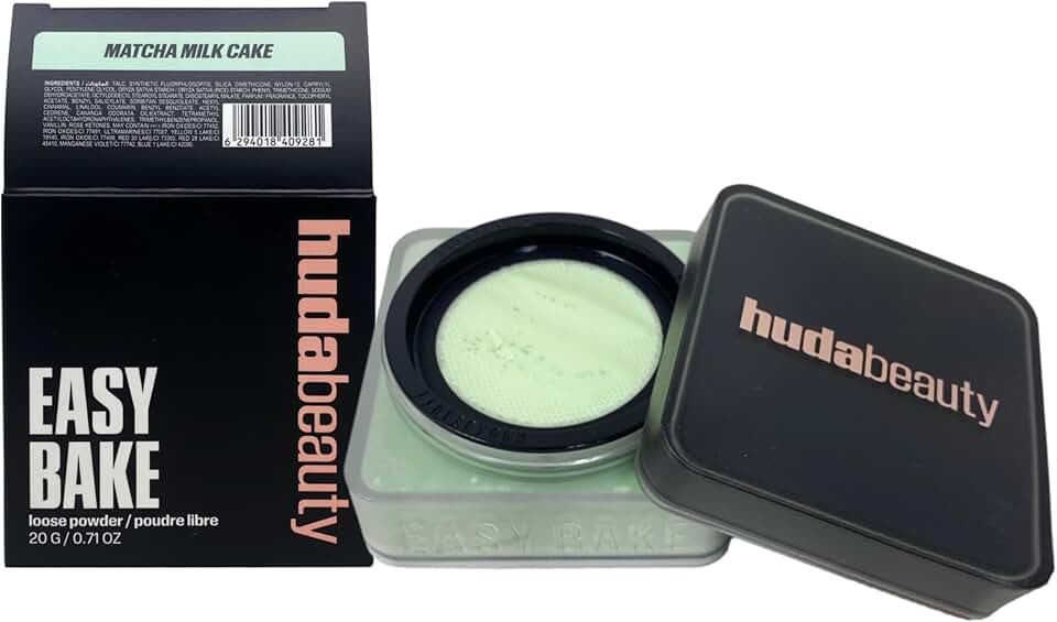 Huda Easy Bake Blurring Loose Baking & Setting Powder - Matcha Milk Cake (20 g / 0.71 oz). What It Is: A lightly pigmented, ultra-brightening setting powder that bakes & sets, blurs fine lines & pores, and sets makeup for 18hrs with an airbrush finish. What Else You Need To Know: The long-wear, non-comedogenic, flashback-free formula blends seamlessly into the skin with a matte finish to control shine and keep makeup in place all day. The vitamin E enriched powder works to subtly color correct, brighten and highlight contours of the face, leaving a translucent veil of color on your skin.