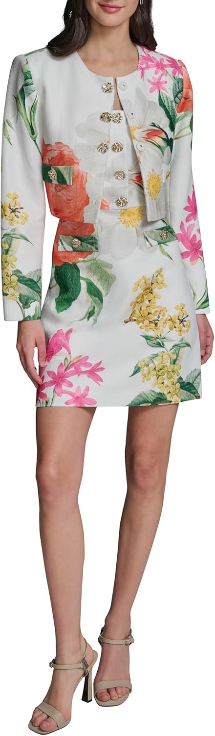 This Karl Lagerfeld Paris Women's Cropped is a Solid Tweed Scoop Neck Flower Buttons Knit Blazer Jacket. DRESS SOLD SEPARATELY.