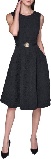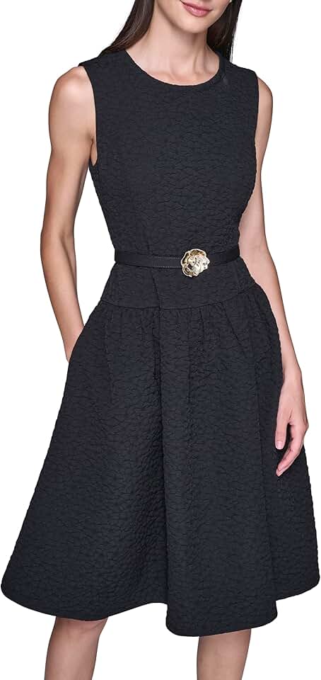 This Karl Lagerfeld Paris Women's Dresses Dress is a Sleeveless Crew Neck Flower Belt Floral Stretch Jacquard A-Line Dress