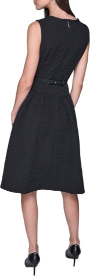 KARL LAGERFELD Women's Sleeveless Crew Neck Flower Belt Floral Stretch Jacquard A-line Dress