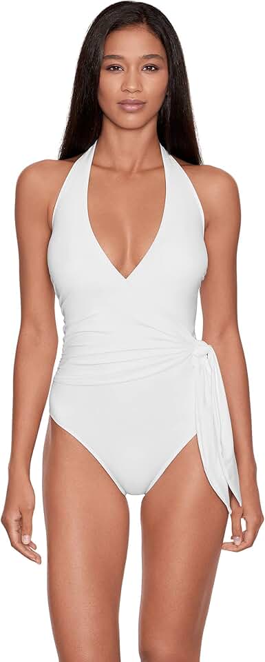 Lend a dose of elegance to your chic and comfy poolside look wearing the LAUREN Ralph Lauren Beach Club Solids Halter Wrap One-Piece. Halter neckline with tie closure on the back neck. Removable soft cups. Lovely tie detailing on the waist. Open back design. Fitted silhouette. 83% nylon, 17% elastane. Hand wash cold, hang dry.