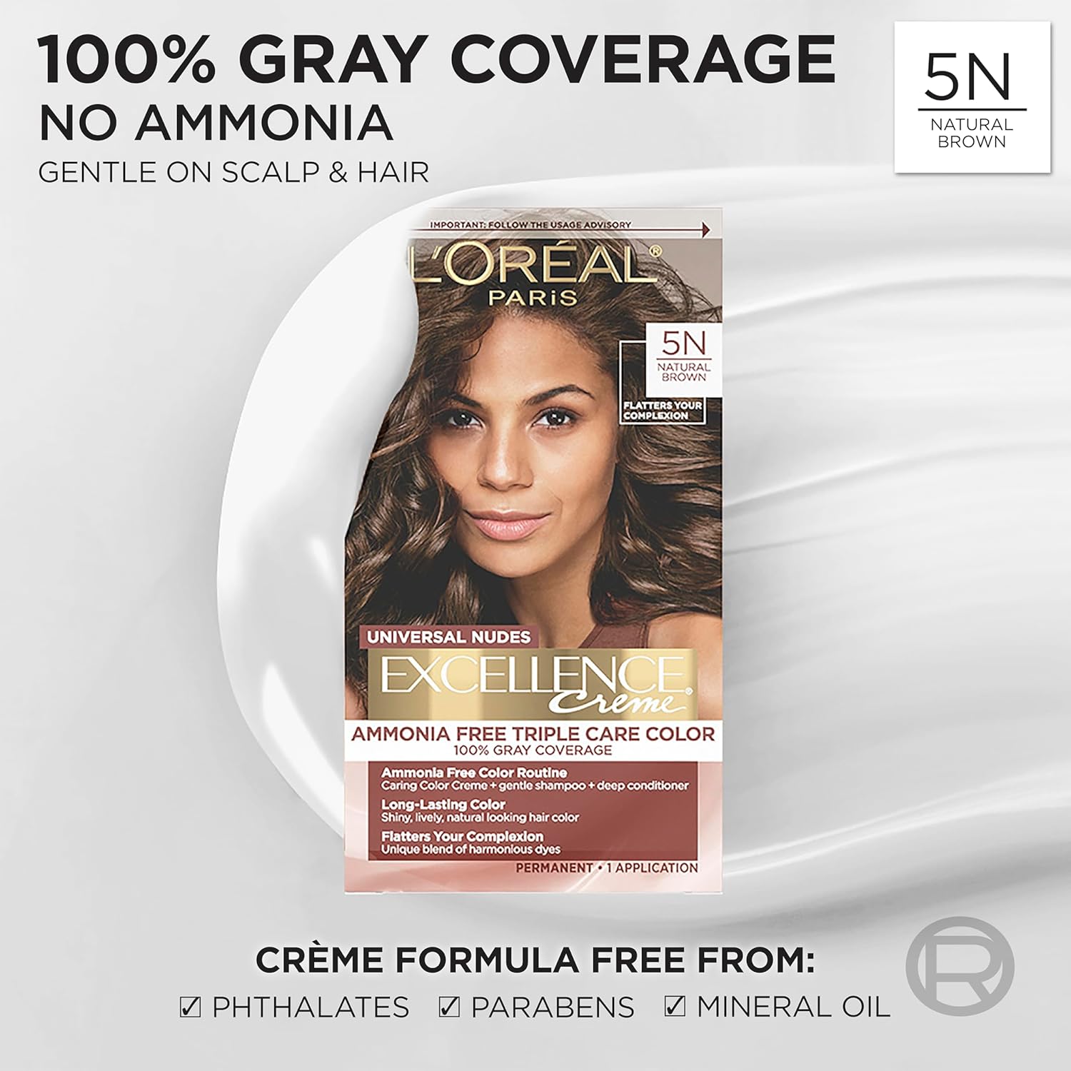 Color without compromise. Introducing Excellence Universal Nudes, permanent hair color with 100% gray coverage and no ammonia, no parabens, no phthalates, and no mineral oil. The Triple Care Color Routine results in rich, radiant, natural looking color and offers 100% gray coverage. The Ammonia-Free Caring Color Creme is enriched with Pro-Keratin Complex and caring agents to protect that hair as it colors. After coloring, follow with the Caring Gentle Shampoo to delicately cleanse the scalp and smooth hair and the Caring Deep Conditioner, infused with Ceramides, to nourish hair without weighing it down. Excellence Nudes enhances your natural hair color, with a blend of cool and warm reflects for long-lasting permanent gray coverage