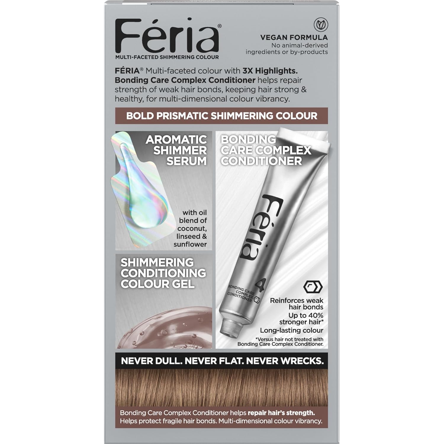 With Feria, what you see is the shimmer. Multi-Faceted shimmering color with 3X highlights delivers intensified, brilliant results. Inspired by cutting-edge fashion, Feria's prismatic color spectrum is custom-blended by L'Oreal master colorists for bold, head-turning shades – no appointment necessary. The revolutionary Power Shimmer Conditioner hydrates and conditions week after week so hair is never wrecked or ravaged.