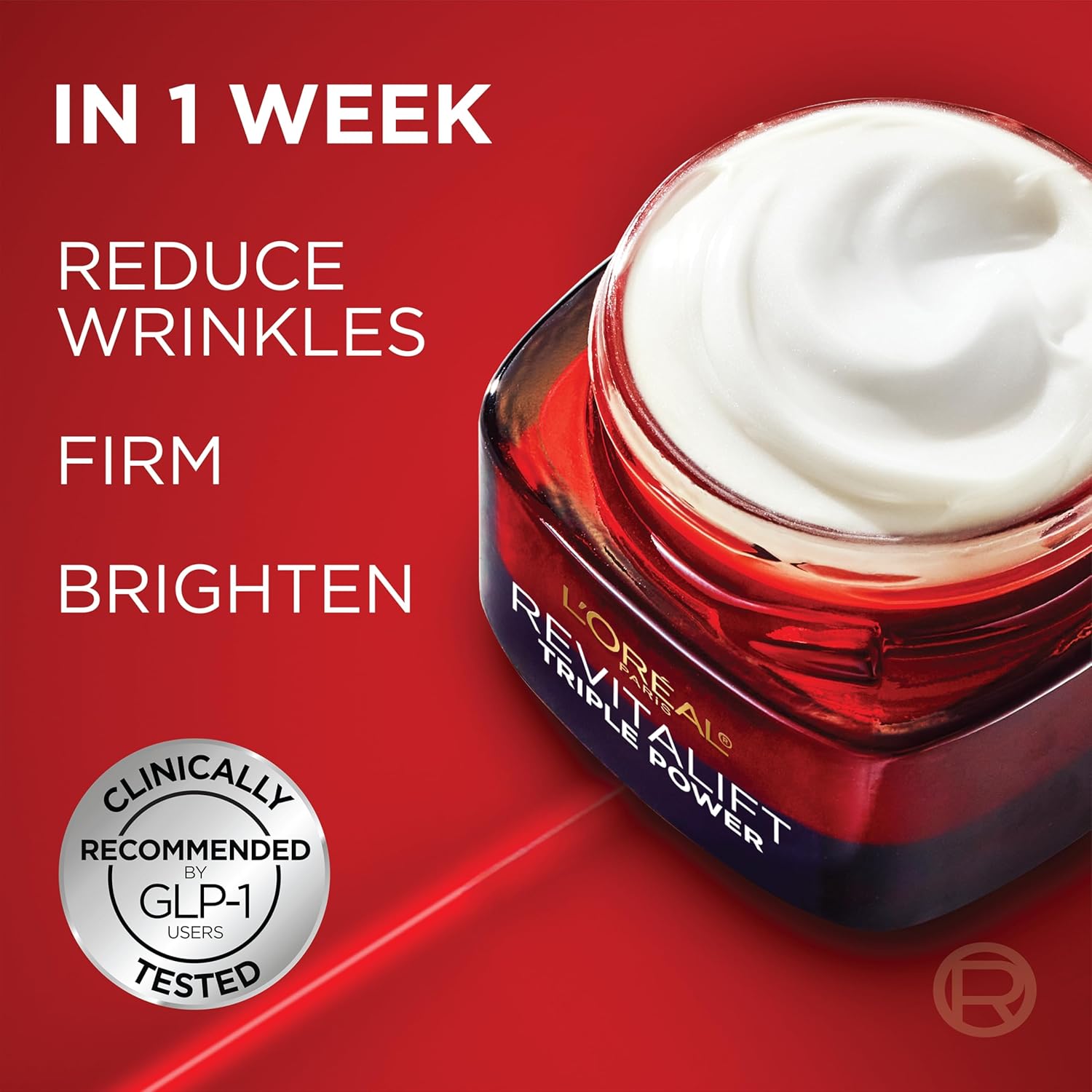 L'Oreal Paris Revitalift Triple Power Daily Face Moisturizer is an anti-aging face moisturizer with visible wrinkle reduction based on a 4 week clinical study. Firms and brightens skin. Available in Original, fragrance free and SPF 30. Packaging and formula may vary. We recently improved our formula with new ingredients, a new fragrance, a new texture and added better results. Always read the ingredient list on the product label before use. Actual testimonial, women were paid to participate in a blind product trial and appear in this commercial.