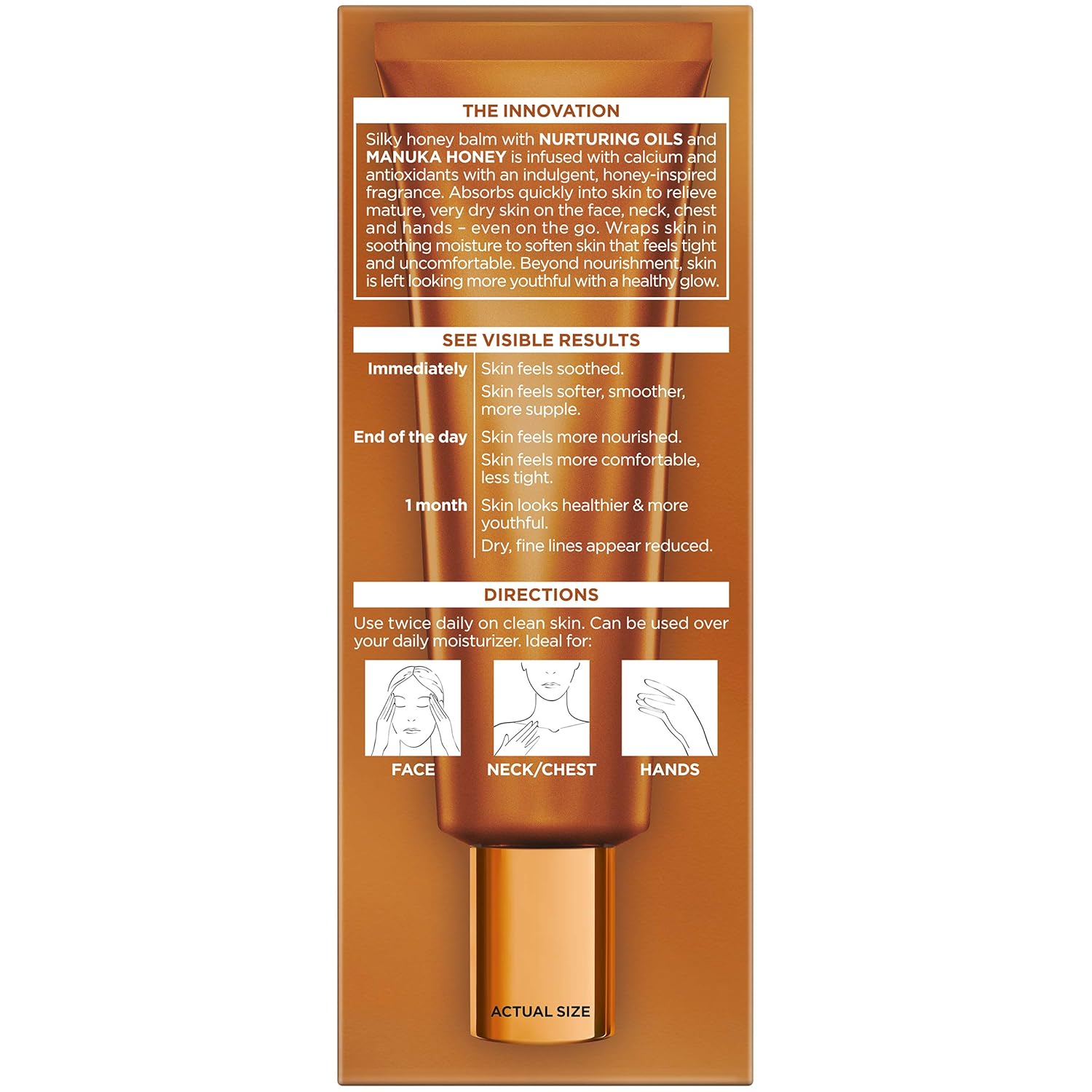 L'Oreal Paris Age Perfect Hydra-Nutrition All-Over Balm is a silky, non-sticky All Over Balm with Manuka Honey Extract and Nurturing Oils that soothes and rescues dry skin on the face, neck, chest and hands. All Over Honey Balm Moisturizer with Manuka Honey Extract and Nurturing Oils soothes with an indulgent honey-inspired fragrance. Absorbs quickly into skin to relieve mature, very dry skin on the face, neck, chest, and hands - even on the go. Wraps skin in soothing moisture to soften skin that feels tight and uncomfortable. Beyond nourishment, skin is left looking more youthful with a healthy glow Manuka Honey is specially sourced from New Zealand. Paraben Free. Mineral Oil Free. Non-Sticky.