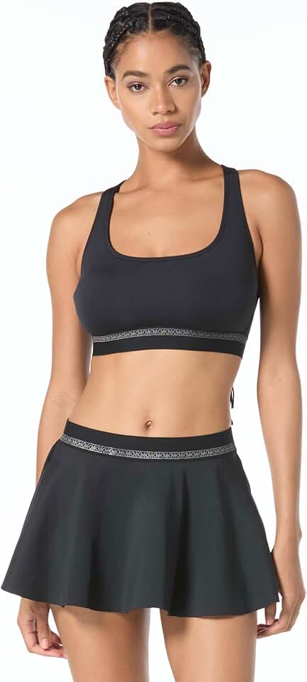 Swim, sport or sprint in this bra bikini top. Cross back straps lay comfortably. Logo elastic trim on a scuba fabric adds a splash of luxury.