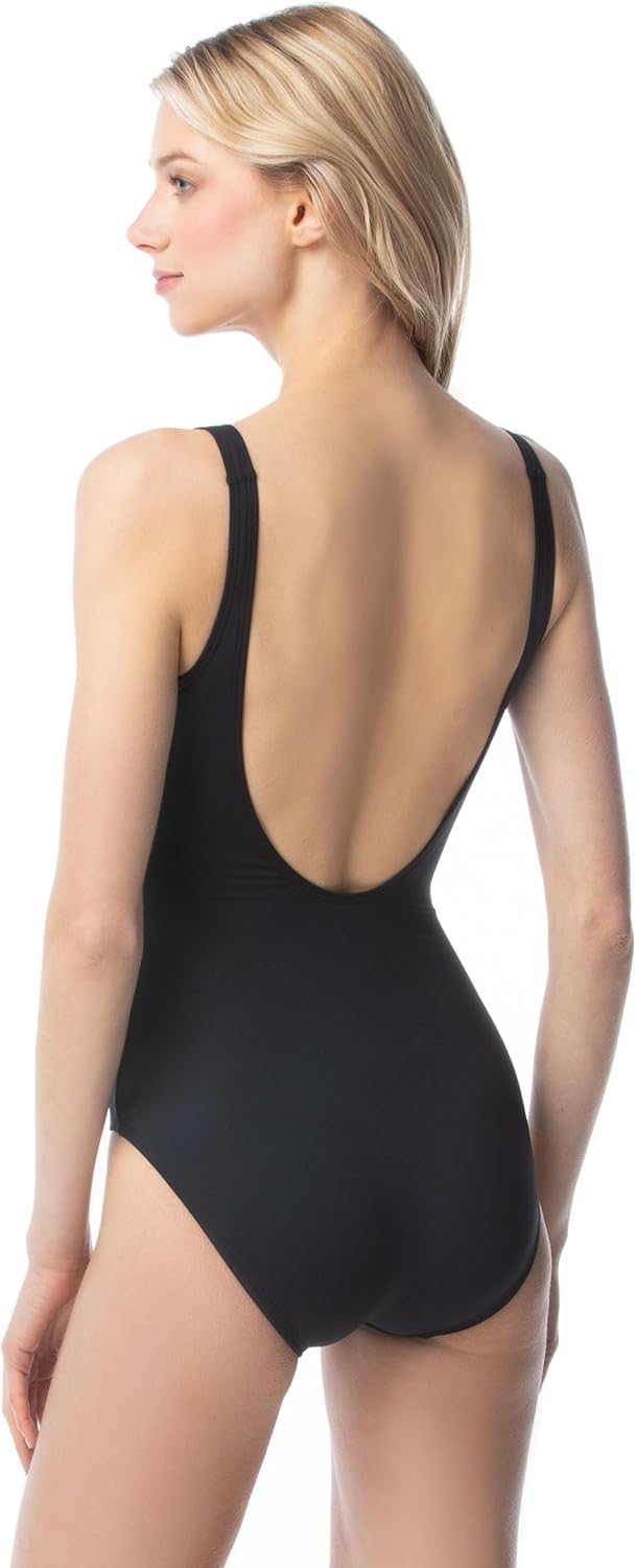A sophisticated yet chic one piece swimsuit. Oversized grommets add a bold statement to a classic solid style.