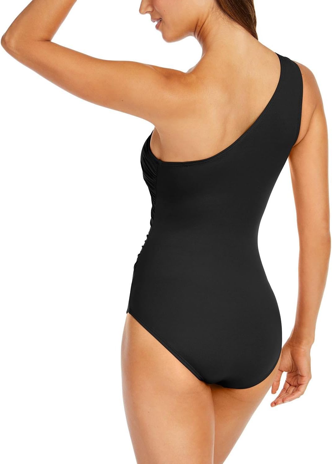 Asymmetrically styled for a standout one piece swimsuit. A metallic ring on the shoulder adds a splash of femininity to a timeless, solid one piece. Smooth shaping liner flatters your figure with comfort.