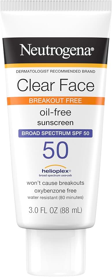 Neutrogena Clear Face Sunscreen Lotion for Acne-Prone Skin is a lightweight, oil-free, fragrance-free, and oxybenzone-free sunscreen for face that delivers Broad Spectrum SPF 50 protection with Helioplex Technology, making it an ideal face sunscreen for oily and acne-prone skin. This dermatologist-tested facial sunscreen provides a water-light, matte finish that won’t cause breakouts and is non-greasy, supporting clear, healthy-looking skin every day. The 3 fl. oz. travel size sunscreen is perfect for daily use and on-the-go protection, fitting easily into your purse or backpack for convenient reapplication. Water-resistant for up to 80 minutes, this face sunscreen helps protect against both UVA and UVB rays during outdoor activities such as gardening, hiking, and biking, so you can enjoy time outside with confidence. The advanced Helioplex Technology ensures stable and effective broad spectrum sunscreen defense, while the oil-free and fragrance-free formula is designed to minimize the risk of irritation and breakouts, making it suitable for sensitive, oily, and acne-prone skin types. Regular use of this oil free face sunscreen, as directed with other sun protection measures, can help decrease the risk of skin cancer and early skin aging caused by sun exposure. Neutrogena Clear Face Sunscreen is recommended for anyone seeking a travel size sunscreen that offers reliable, broad spectrum SPF 50 protection without clogging pores or leaving a greasy residue. Choose this dermatologist-tested sunscreen lotion for face to keep your skin protected, comfortable, and looking its best every day, whether at home or on the go.