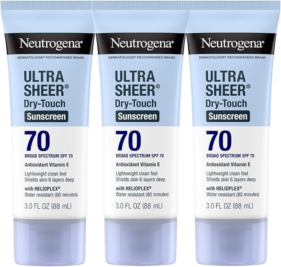 Neutrogena Ultra Sheer Dry-Touch Sunscreen with Broad Spectrum SPF 70 travel size sunscreen provides powerful sun protection that you will love to wear without the heavy finish. Featuring Avobenzone, Homosalate, Octisalate, Octocrylene as active ingredients, this non-greasy body sunscreen is oxybenzone free, Hawaii Act 104 compliant. With Helioplex technology to provide superior UVA/UVB protection from aging UVA rays and burning UVB rays. Enriched with antioxidant vitamin E, the lightweight SPF sun screen lotion with Dry-Touch technology absorbs fast for a clean, ultra-light feel and non-shiny finish. Lotion sunscreen formula is non-comedogenic and PABA-free. This Neutrogena sunscreen is water-resistant for up to 80 minutes and comes from a dermatologist recommended sun care brand. Apply prior to sun exposure to keep skin protected during outdoor activities like gardening, biking, hiking, boating or walking. Protect yourself as you get your daily dose of sunshine.