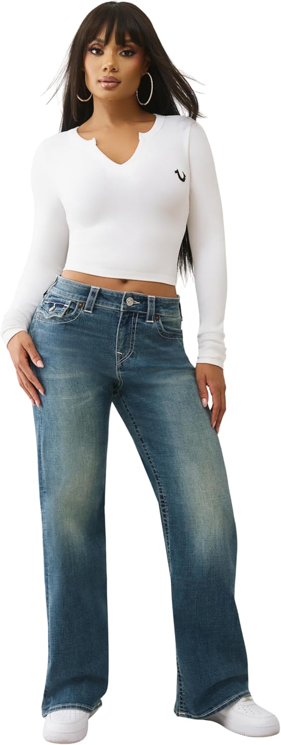 Own the room in the True Religion Bobbi Baggy Jean Flap — a fearless denim essential designed for women who demand bold style with uncompromising comfort. These wide-leg jeans feature distressed hems for a lived-in edge, front whiskering for dimension, and True Religion’s signature Super T stitching that defines premium craftsmanship. The back flap pockets are finished with stitched horseshoe logos, making these jeans instantly recognizable and unapologetically iconic. Designed with a relaxed, baggy fit, they balance streetwear cool with effortless versatility, pairing perfectly with sneakers, heels, or boots. Made from a premium blend of 70% cotton, 19% polyester, 9% rayon, and 2% elastane, they deliver lasting structure, softness, and a touch of stretch for all-day comfort. The Bobbi Baggy Jean Flap is more than women’s jeans — it’s a statement of individuality, built for those who live loud, dress bold, and refuse to blend in.