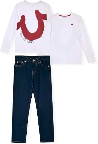 Dress your young trendsetter in style with this True Religion Boys 2-Piece Clothing Set. This set includes a classic denim jean paired with a coordinating long sleeve tee shirt, providing a versatile outfit for any occasion. Available in sizes 4 through 12, and a range of vibrant colors including yellow, red, black, white, blue, and more, these sets offer options to suit every taste. Crafted from high-quality fabrics, these boys' jeans and tee shirt sets are designed for durability and comfort, making them ideal for active kids. Whether for school days or weekend adventures, these sets are a must-have addition to any young boy's wardrobe. Mix and match the pieces to create endless outfit combinations, ensuring maximum versatility and value. Give your little one the gift of style and comfort with this True Religion Boys 2-Piece Clothing Set. Upgrade their wardrobe with these fashionable and practical sets that effortlessly blend style and functionality. Dress to impress with True Religion.