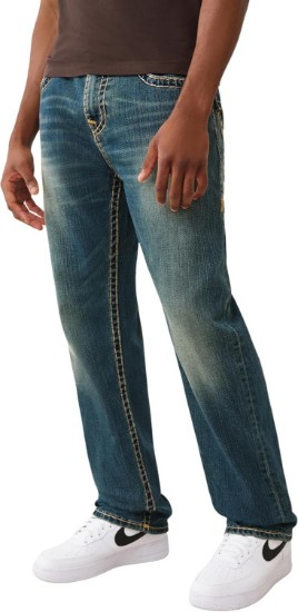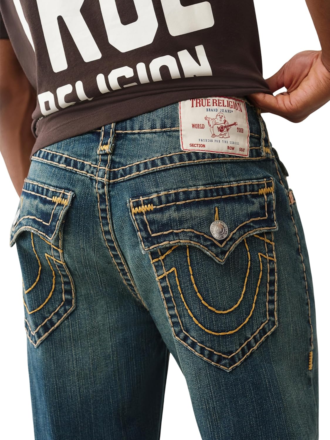 True Religion Bobby Super T Flap Jeans are a bold take on a classic. Featuring a relaxed fit with a bootcut leg, these jeans deliver all-day comfort with signature streetwear edge. The standout Super T contrast stitching and flap back pockets with horseshoe embroidery offer unmistakable True Religion style. Crafted from durable cotton-blend denim, they’re built to wear and made to stand out. Relaxed bootcut fit with signature Super T contrast stitching Flap back pockets featuring iconic horseshoe embroidery Mid-rise waist for a comfortable, everyday fit Zip fly with button closure Premium stretch denim for added flexibility and comfortAttributes: Brand: True Religion Product Name: Bobby Super T Flap Jeans Gender: Men Fit: Relaxed Bootcut Rise: Mid Rise Closure: Zip fly with button Pockets: 5-pocket style with flap back pockets Stitching: Super T bold contrast stitching Details: Horseshoe embroidery, branded hardware Style: Premium Denim / Casual / Streetwear Care Instructions: Machine washable.