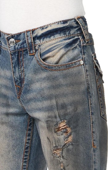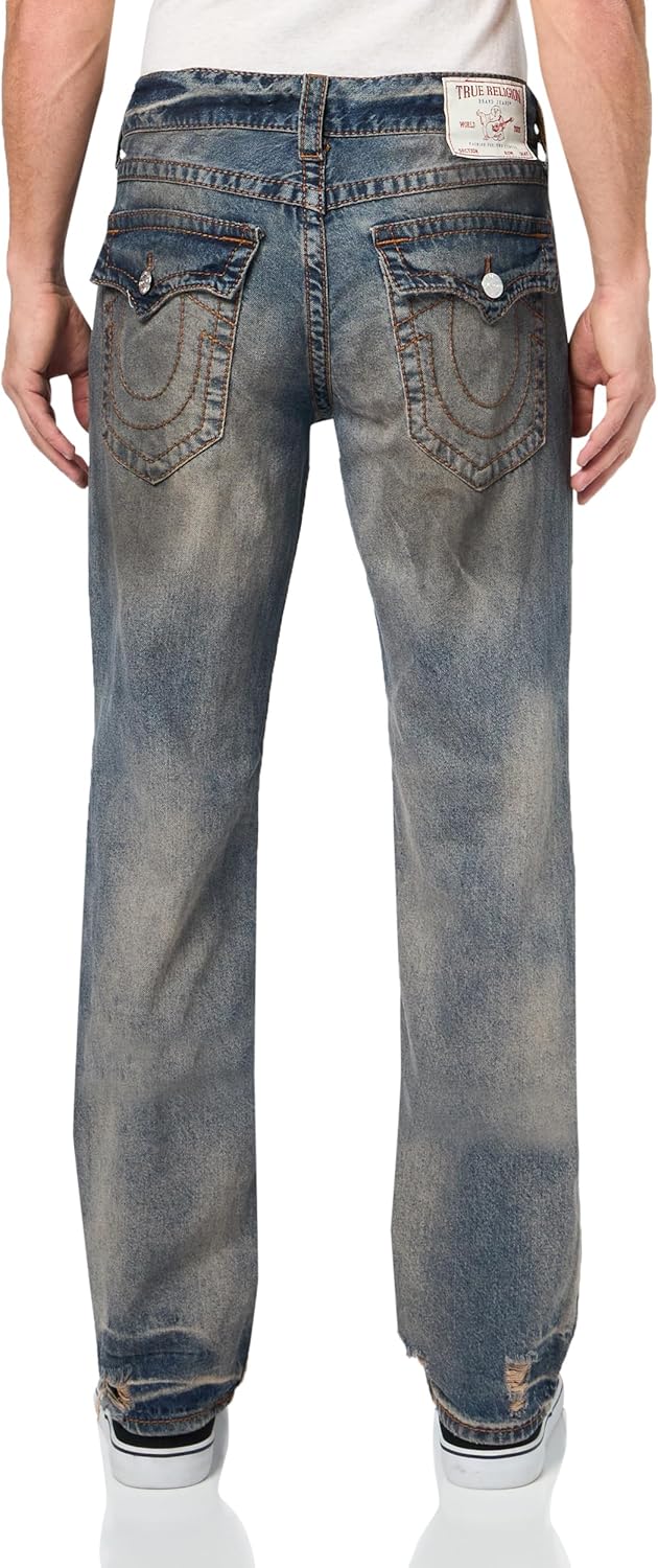True Religion Ricky Big T Flap Jeans deliver iconic style with rugged appeal. Made with premium stretch denim, this straight-leg silhouette features bold Big T contrast stitching, flap back pockets with signature horseshoe embroidery, and a comfortable mid-rise waist. With a 34' inseam, these jeans are tailored for a longer fit—perfect for pairing with boots or sneakers. Whether you're dressing up or going casual, these jeans make a confident statement. Classic straight-leg fit with a longer 34' inseam Eye-catching Big T contrast stitching for signature True Religion style Flap back pockets with embroidered horseshoe logos Zip fly with branded button closure Crafted from high-quality stretch denim for everyday comfortAttributes: Brand: True Religion Style Name: Ricky Big T Flap Jeans Gender: Men Fit: Straight Leg Inseam: 34 inches Rise: Mid Rise Closure: Zip fly with button Material: Cotton/spandex stretch denim Pockets: 5-pocket style with back flap pockets Details: Big T contrast stitching, horseshoe embroidery Style Type: Premium Denim / Streetwear / Casual Care Instructions: Machine washable
