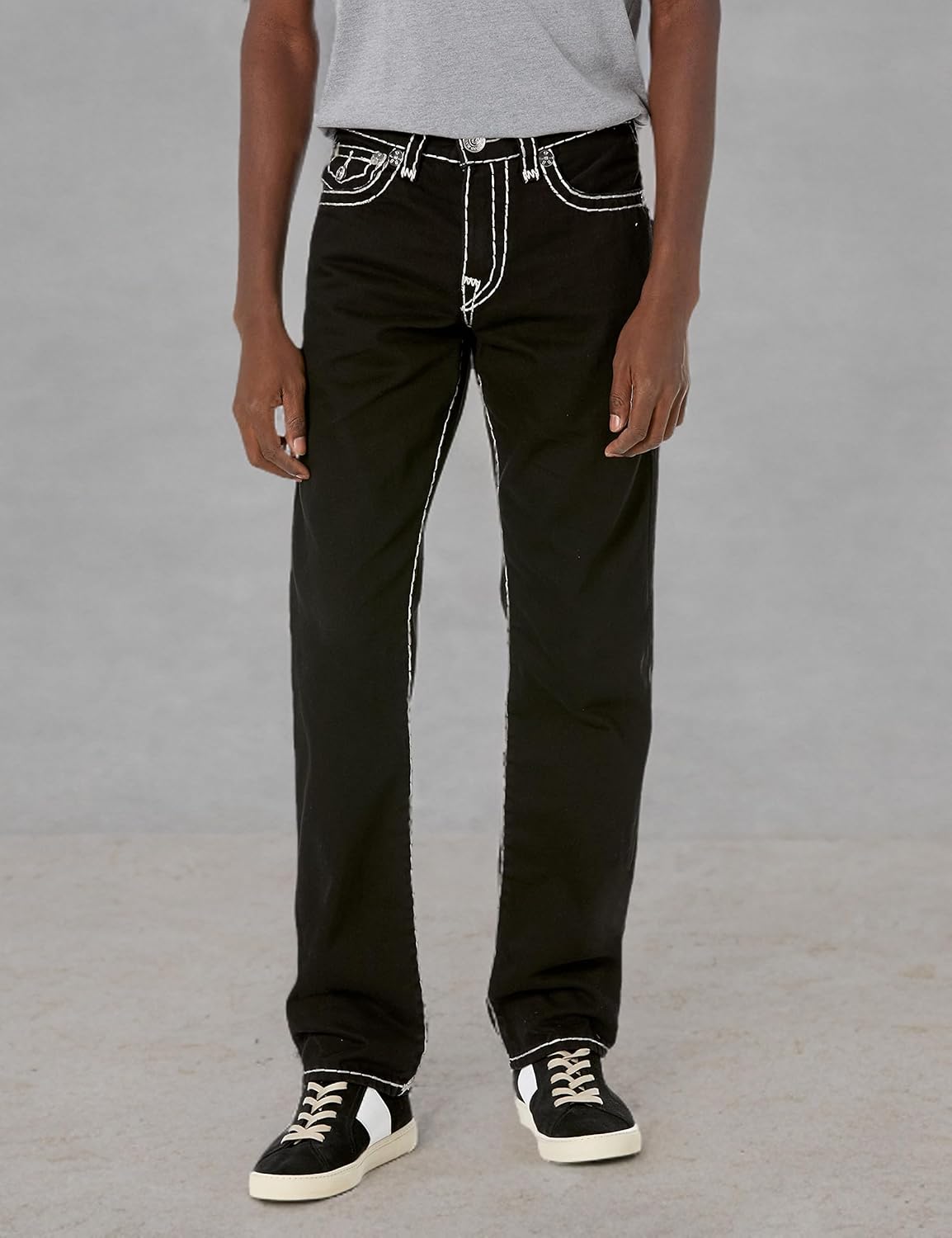 The True Religion Ricky Super T Straight Leg Jean is day-to-night denim built to stand out. Featuring clean hardware, contrast Super T stitching, and 1/2-inch horseshoe detailing along the back flap pockets, it is a timeless silhouette in true religion jeans men reach for first, available in multiple washes.