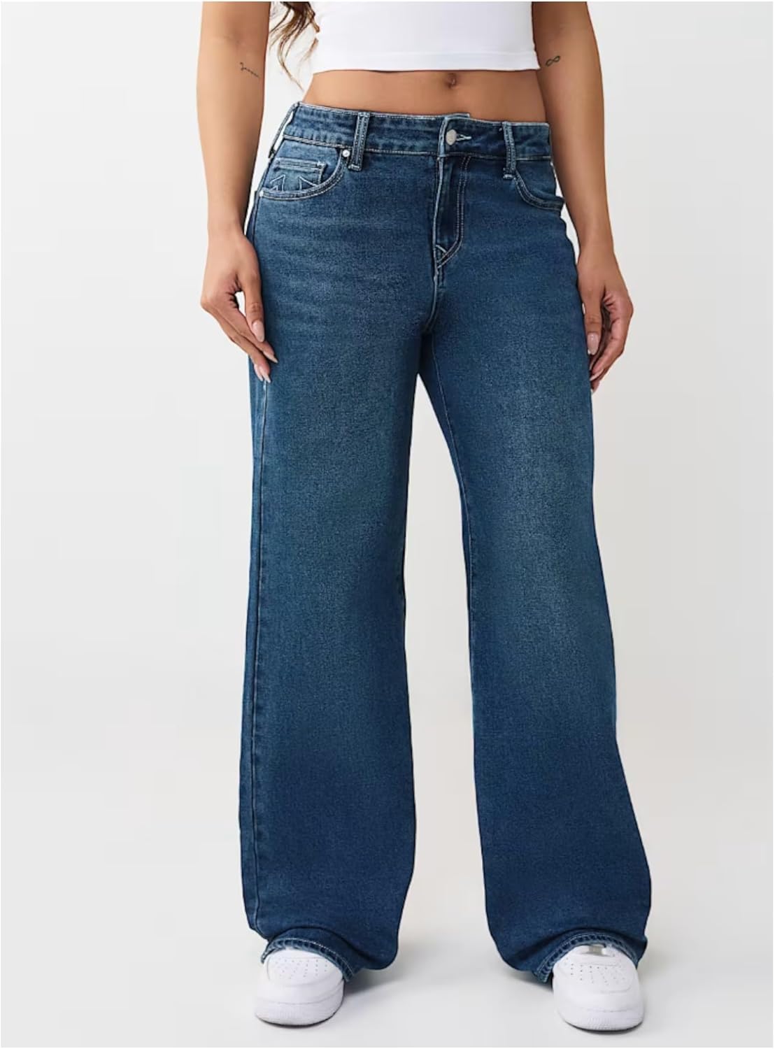 Volume speaks louder. The Bobbi Mid Rise Baggy Jean features a roomy wide fit, a dark wash for drama, clean single-needle stitching and signature horseshoes on the back pocket for a major True flex.