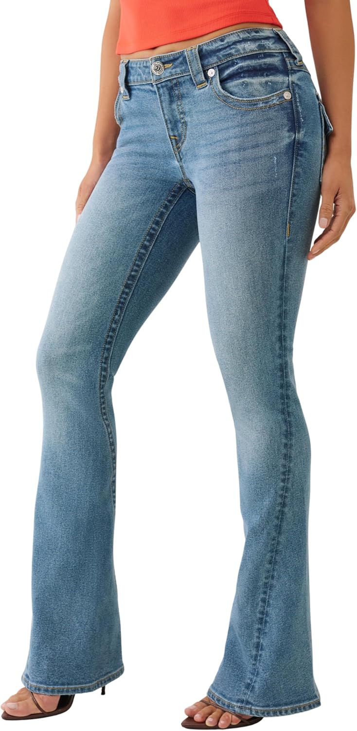 True Religion Women's Joey Low Rise Flare Flap Jeans. Designed with a flattering low-rise waist and dramatic flare leg, these jeans bring back bold, retro-inspired style. Signature flap back pockets with horseshoe embroidery and contrast stitching elevate the classic denim look. Crafted from premium stretch denim for comfort and a curve-hugging fit, these jeans are perfect for standout casual outfits or dressed-up streetwear.Attributes: Brand: True Religion Style Name: Joey Fit: Low rise, flare leg Pockets: Flap back pockets with signature embroidery Closure: Zip fly with button closure Inseam: Varies by size Details: Contrast stitching, logo hardware Care: Machine washable