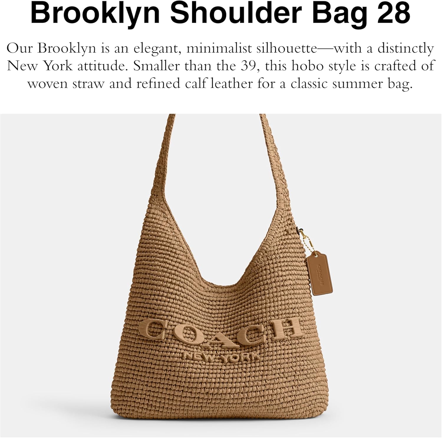 Our Brooklyn is an elegant, minimalist silhouette—with a distinctly New York attitude. Smaller than the 39, the hobo style is crafted of beautifully woven straw and refined calf leather. Featuring a spacious interior for access to essentials, the streamlined 28 has a comfortable, wide shoulder strap and an easy magnetic snap closure. Handle with 10 1/2' drop, 11 1/2' (L) x 8 3/4' (H) x 2 3/4' (W).