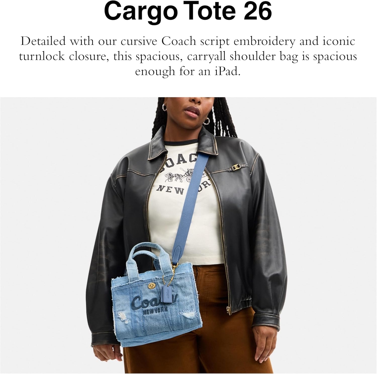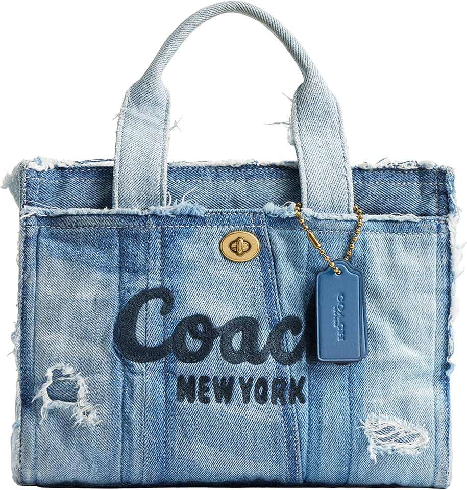 Carry as much (or as little) as you like with our lightweight Cargo tote. Detailed with our cursive Coach script embroidery and iconic turnlock closure, this spacious, carryall shoulder bag is spacious enough for an iPad. Crafted with upcycled signature denim that's well-loved in all the right places - for an iconic Coach cargo crossbody bag for women. Features a zip-top closure, fabric lining, handles with 4' drop, outside turnlock and snap pockets, detachable strap with 24' drop for shoulder or crossbody wear, fits an iPad, 10 1/4' (L) x 7 3/4' (H) x 5' (W).