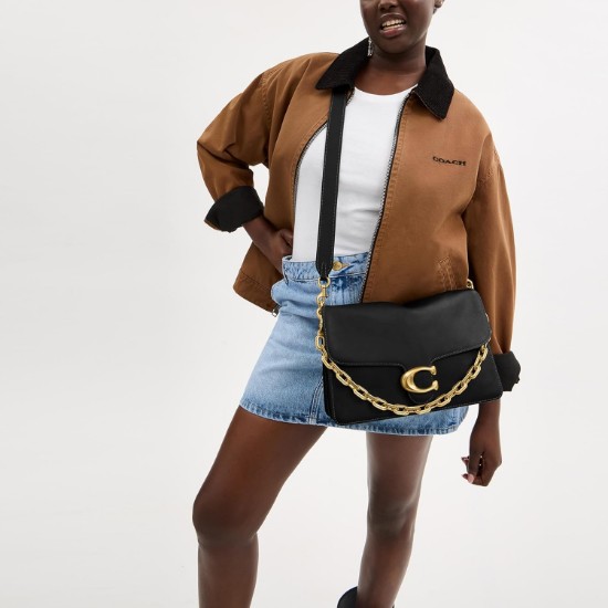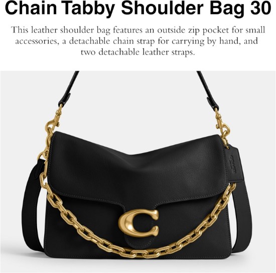 Editor's Notes: A new take on an archival Coach classic, the Soft Grain Chain Tabby is designed for elegance with a sophisticated chain strap. Carry this stylish shoulder bag by its chain, or let it hang as a decorative accent