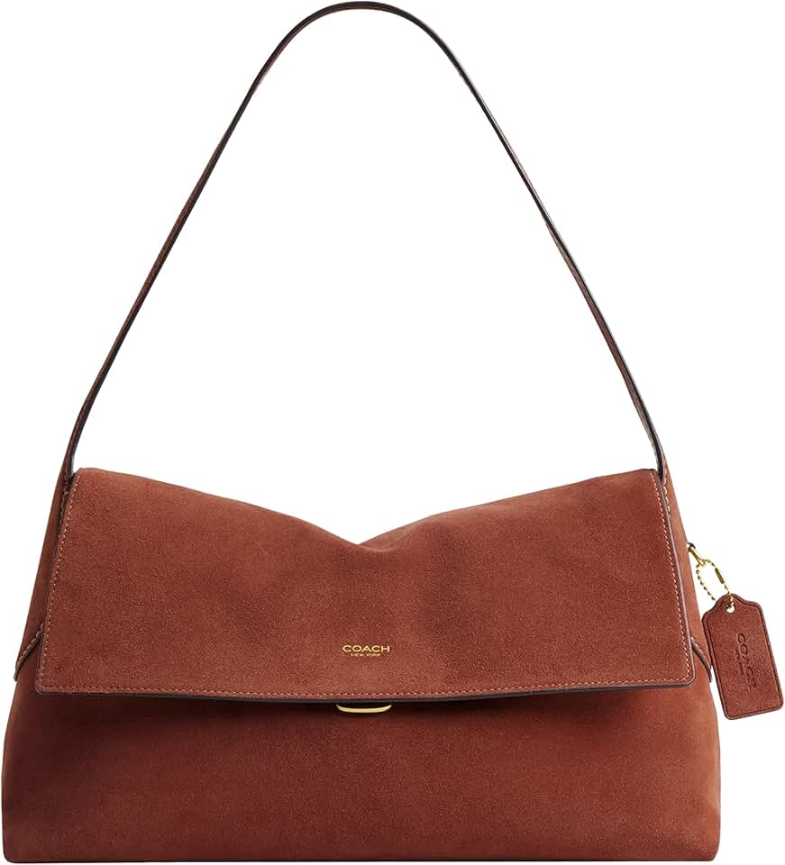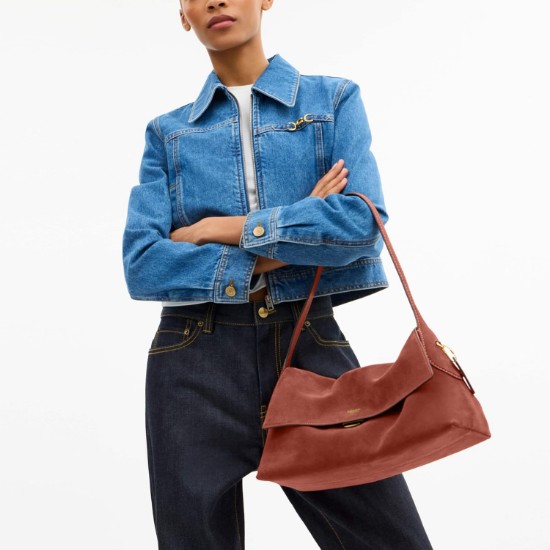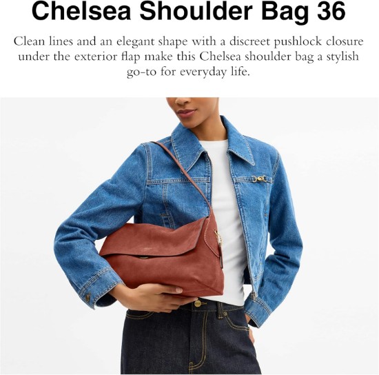Clean lines and an elegant shape with a discreet pushlock closure make this Chelsea shoulder bag a stylish go-to for everyday life. Featuring a spacious interior with a zip pocket for access to essentials, this streamlined women's shoulder bag is crafted with luxurious suede and soft nappa grain leather, leather lining and handle with 9 1/2' drop. Measures 11 3/4' (L) x 7' (H) x 4 3/4' (W).