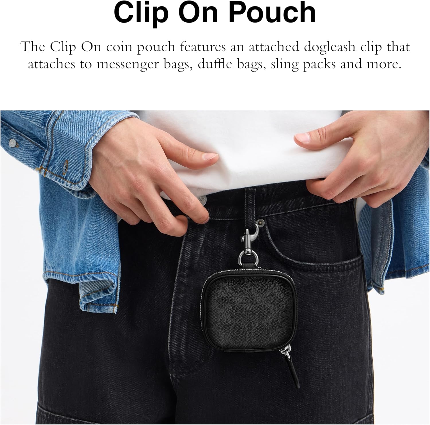 Editor's Notes: Made for the extras (extra essentials, extra style), the Clip On Pouch is crafted of our Signature canvas and is the perfect addition to your favorite Coach bag