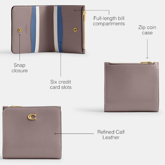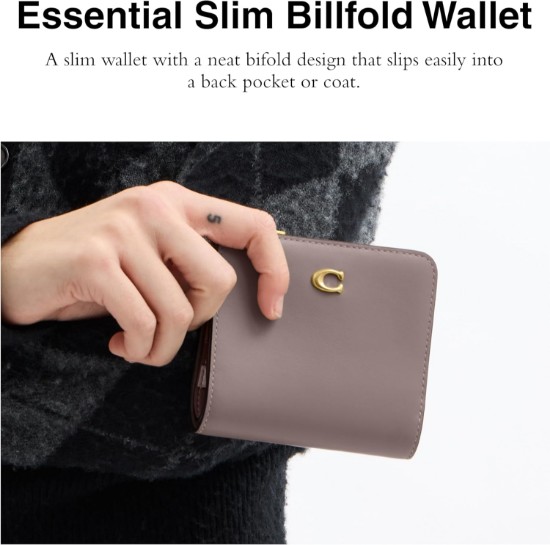 Our refined calf leather is sophisticated & sleek - for a perfectly iconic Coach woman's wallet. A minimalist design that's easy to put in your back pocket or stash in your bag, this slim wallet features six credit card slots, full-length bill compartment, snap closure. zip coin case, 4' (L) x 3 3/4' (H) x 1' (W)