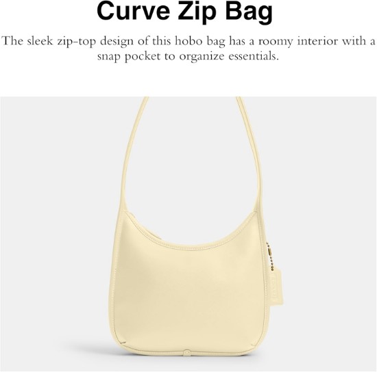Iconic style meets effortless sophistication-introducing the COACH Curve Zip Bag! Crafted from luxurious glovetanned leather, this sleek yet versatile bag is designed to elevate any look. The zippered top closure keeps your essentials secure, while the inside snap pocket adds a touch of convenience for effortless organization. Lined with soft cotton, it offers a refined interior that's as chic as its exterior. Carry it by the top handle for a polished, ladylike feel or sling it over your shoulder with the adjustable strap for hands-free elegance.