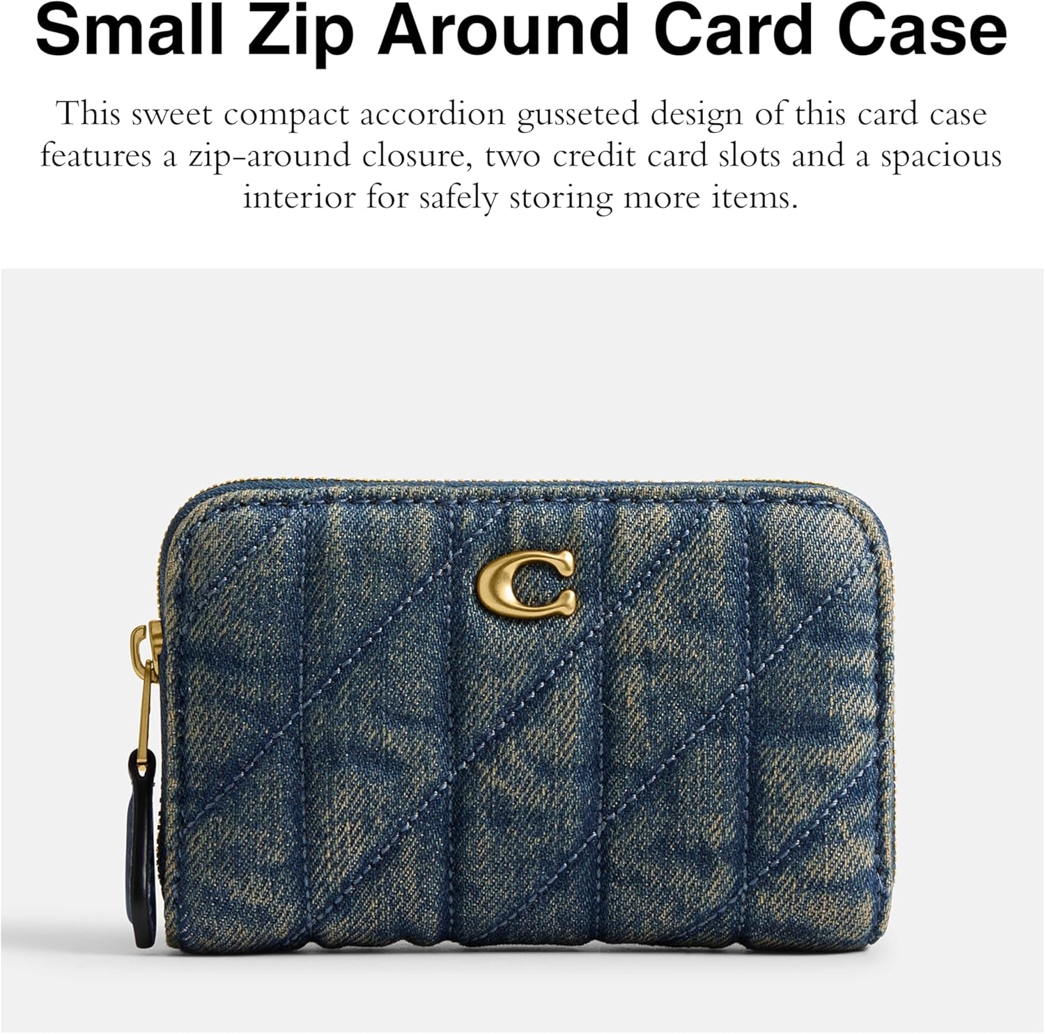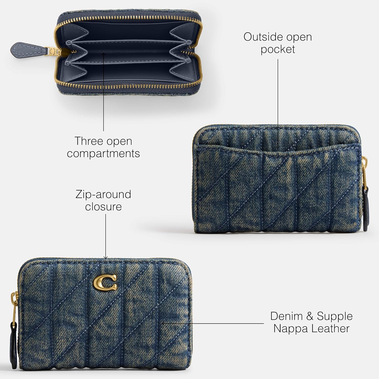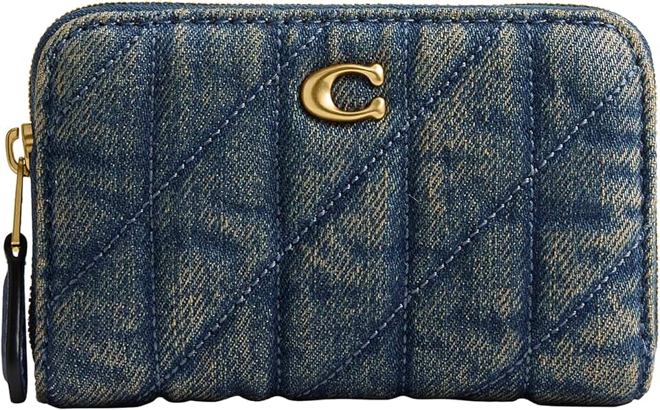 This sweet compact accordion gusseted design of this card case features a zip-around closure, two credit card slots and a spacious interior for safely storing more items. Crafted of quilted loved denim and supple nappa leather, this front pocket wallet holds cards, cash and other small essentials in a slim design that slips easily into pockets. Three open compartments, zip-around closure, outside open pocket, 4 1/4' (L) x 2 3/4' (H) x 3/4' (W).