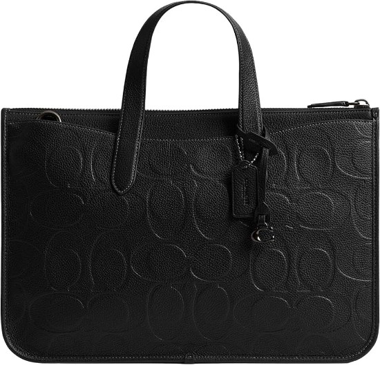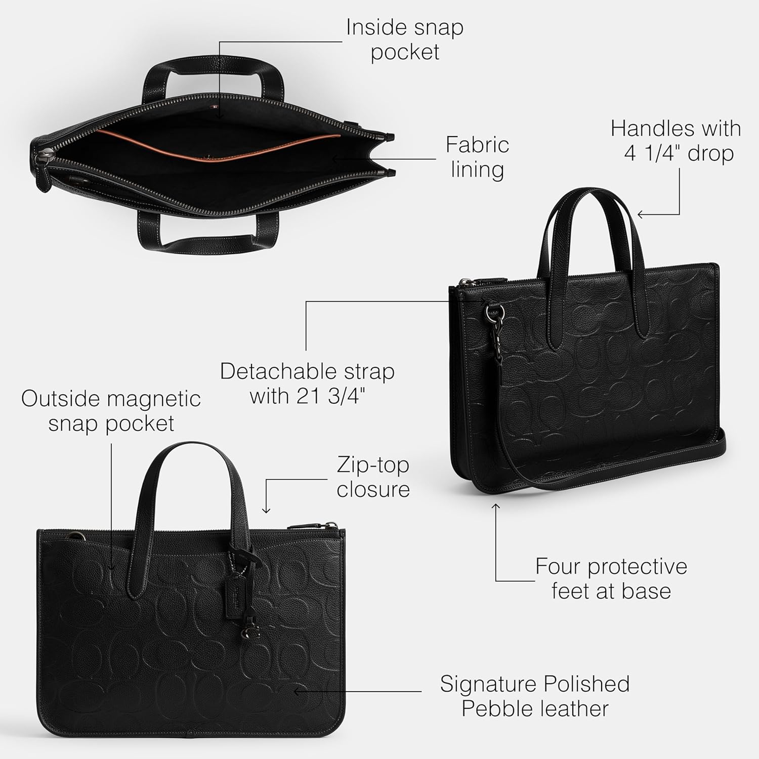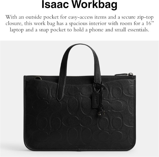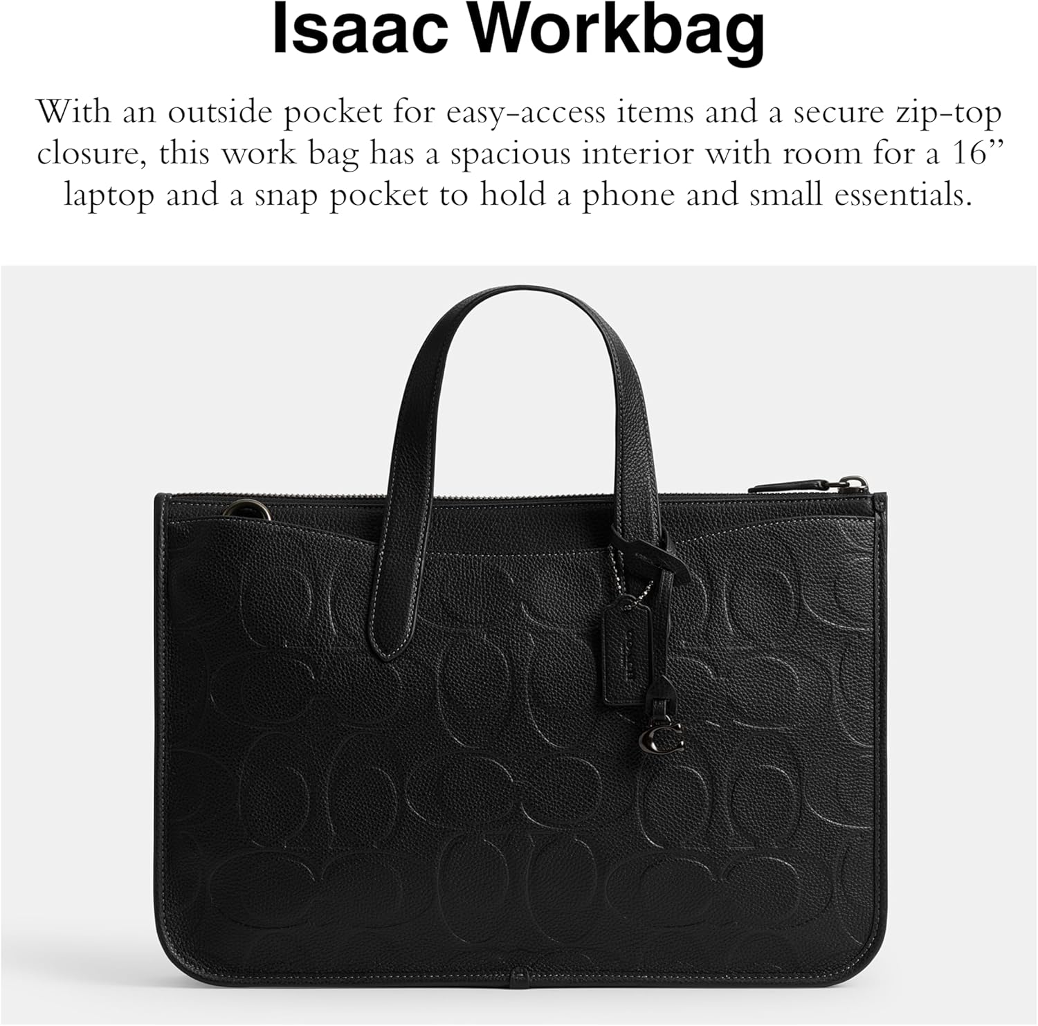 A hardworking business bag, our Isaac Workbag is a confident carryall with sleek functionality. With an outside pocket for easy-access items and a secure zip-top closure, it has a spacious interior with room for a 16” laptop and a snap pocket to hold a phone and small essentials. Crafted of Signature polished pebble leather, the organized style is finished with top handles and a crossbody strap for hands-free wear.