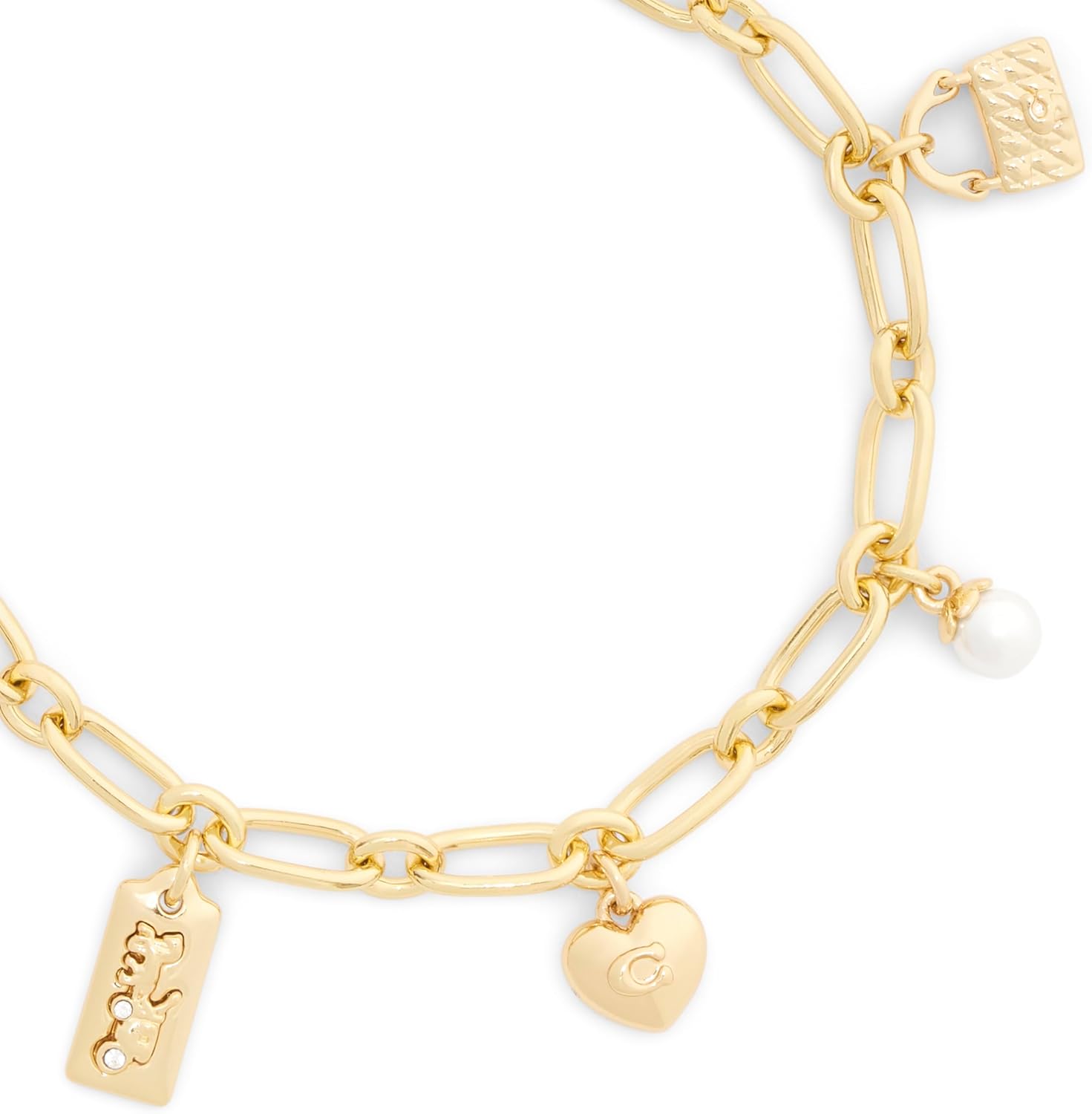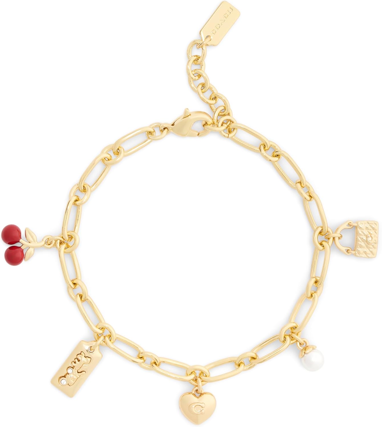 Refined chain link bracelet featuring whimsical mixed charms for a playful touch. Charms include puffy heart adorned with signature sculpted C, horse and carriage motif hangtag, iconic quilted purse, cherry and minimal pearl. Bracelet has an adjustable lobster clasp closure. Made from brass, glass crystal, imitation pearl and enamel.