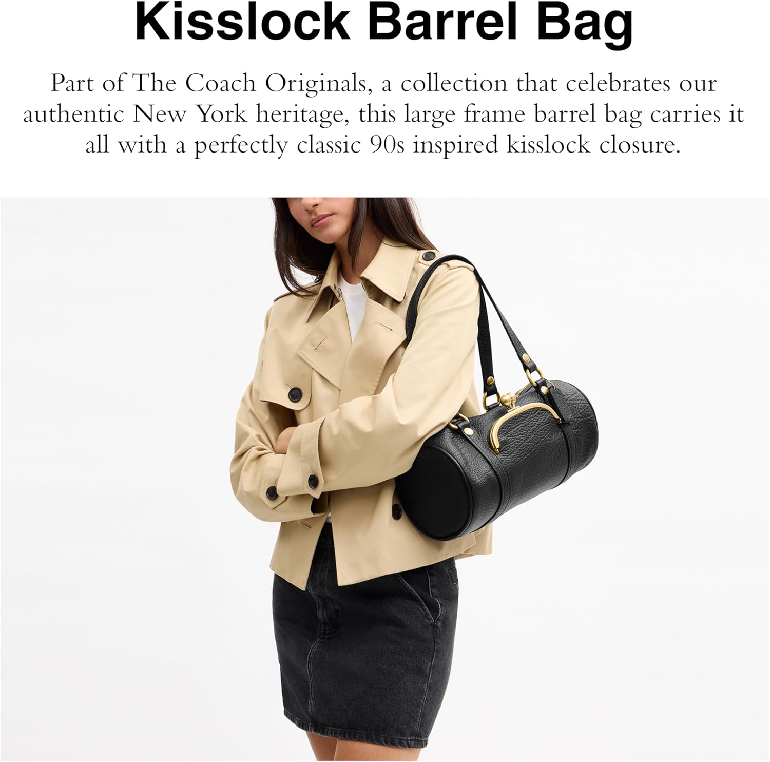 Part of The Coach Originals, a collection that celebrates our authentic New York heritage, this large frame barrel bag carries it all with a perfectly classic 90s inspired kisslock closure. Crafted of textured pebble leather for added character, this bag features a zip-top closure, fabric lining, handles with 10' drop, outside kisslock pocket, 13 1/4' (L) x 6' (H) x 6' (W).
