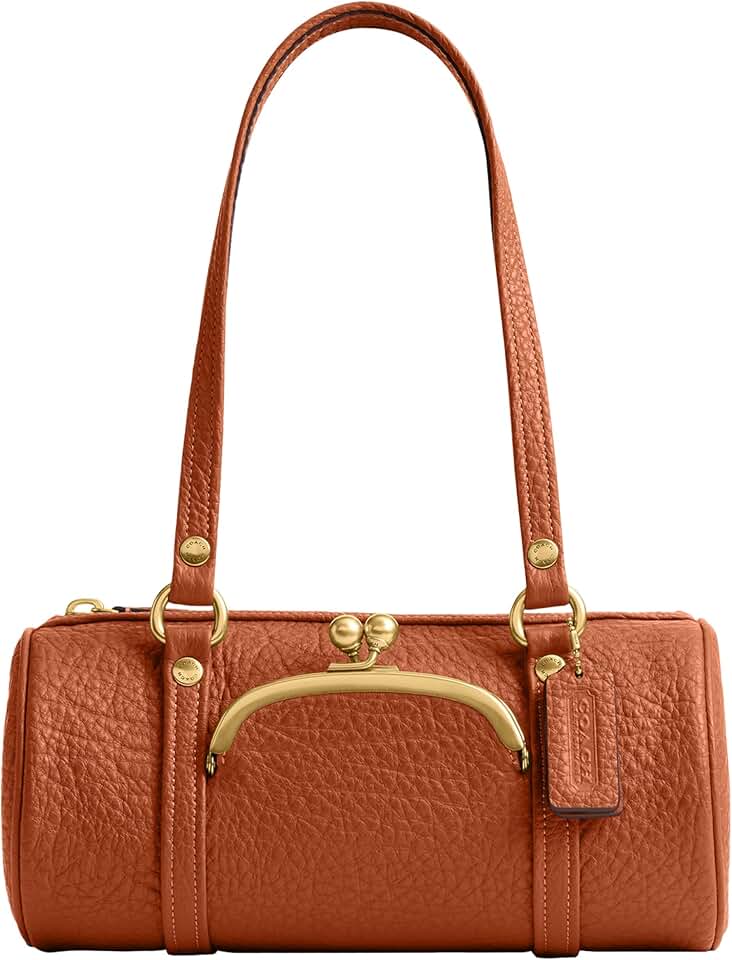 Part of The Coach Originals, a collection that celebrates our authentic New York heritage, this large frame barrel bag carries it all with a perfectly classic 90s inspired kisslock closure. Crafted with velvety suede and supple full-grain leather for an elevated, sophisticated look, this spacious bag features an inside snap pocket, zip-top closure, fabric lining, handles with 9 3/4' drop, outside kisslock pocket, 10 3/4' (L) x 5' (H) x 5' (W).