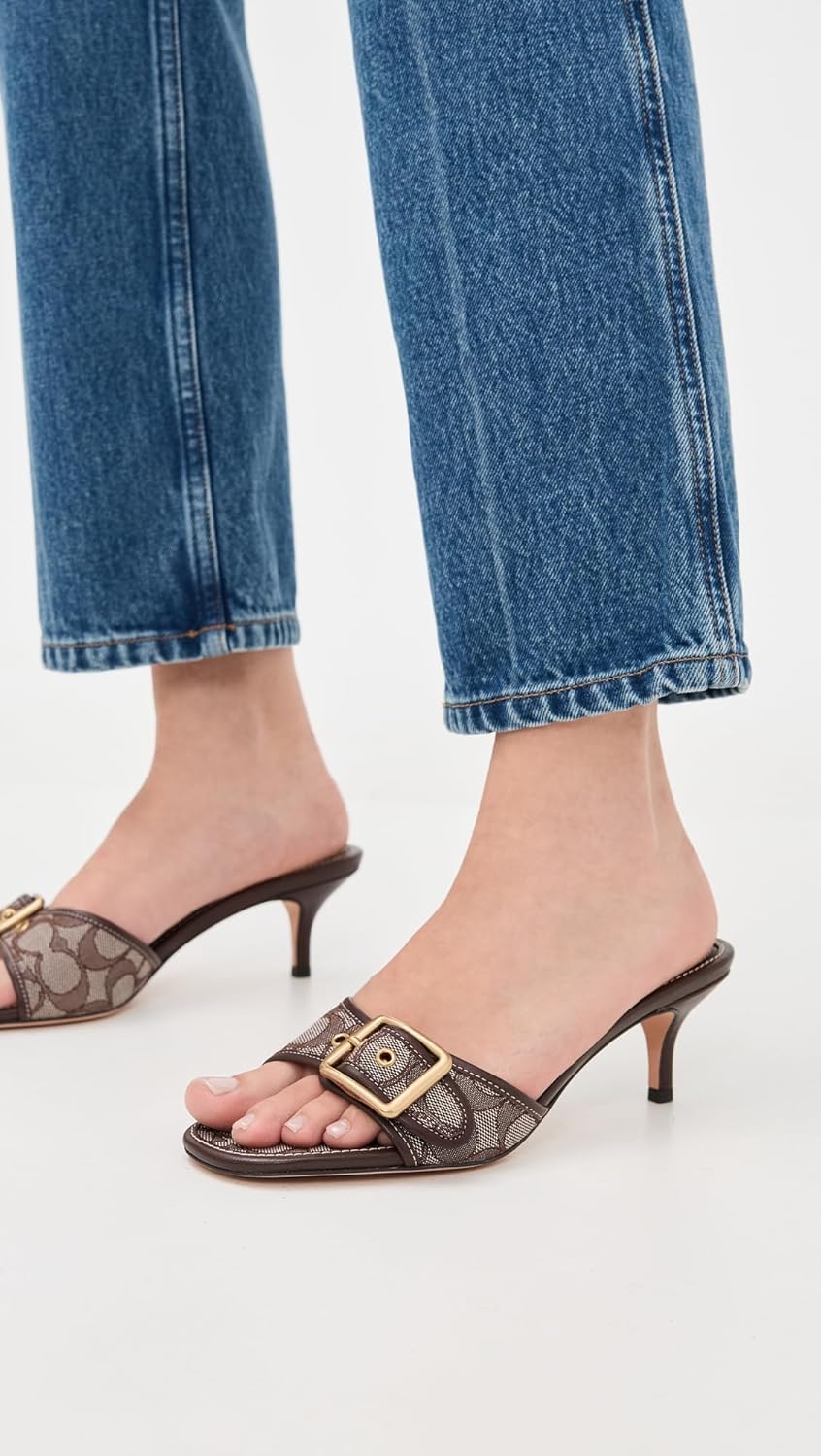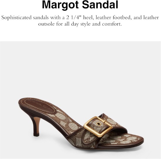 Our Margot Sandal with kitten heel, gold buckle and Signature jacquard and leather pattern gives all the Fall vibes. This sophisticated slip on features signature jacquard and leather upper, this man-made leather lining, leather footbed, leather outsole and 2 1/4' heel that take you to work or a night on the town